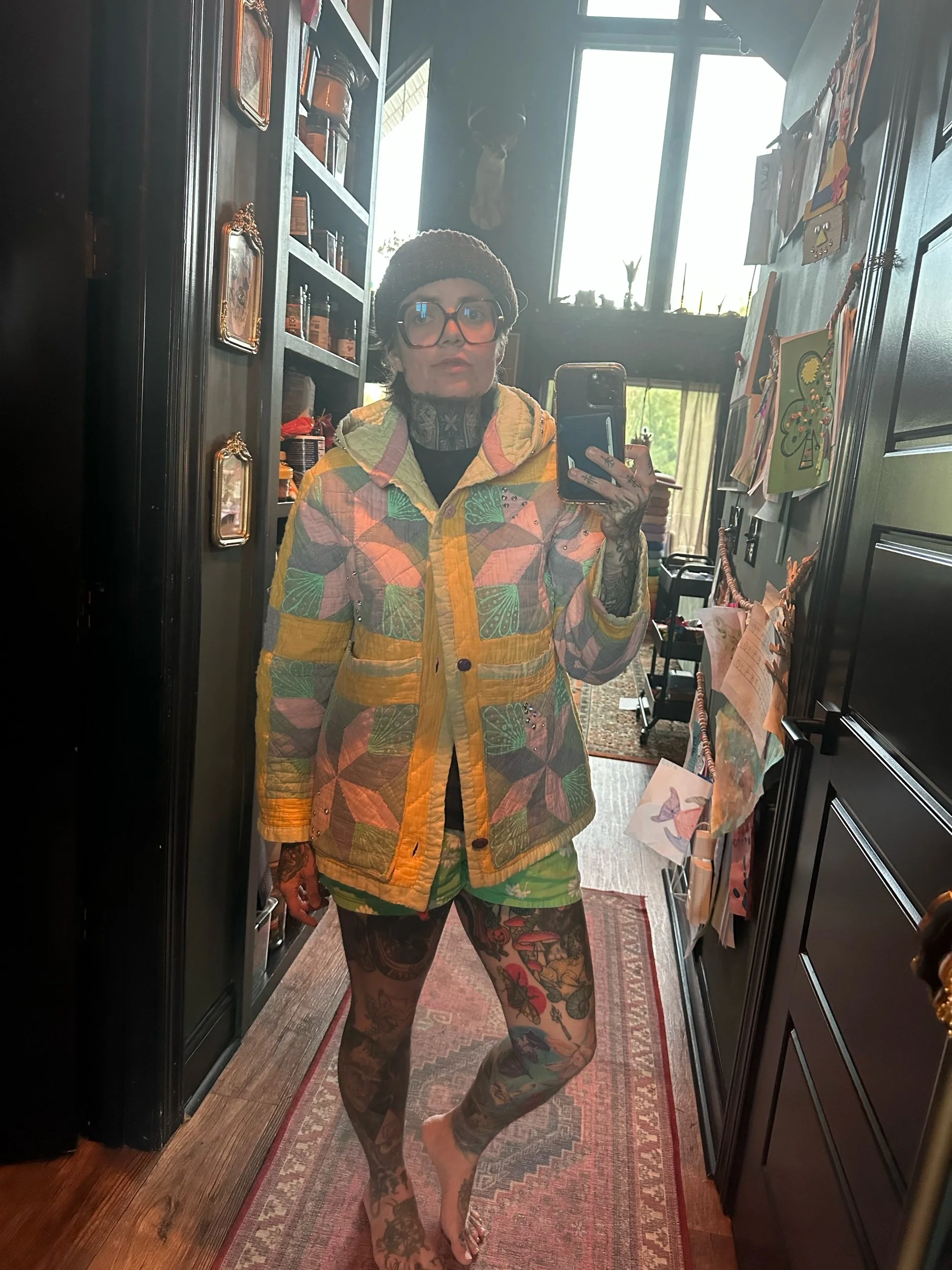 Shop Clear All | Name Wall Hangings | Chain Stitch Patches and Gift tags | Ornament | Trick or Treat bags | Ready to Ship Tops and Pants | Xmas Stockings | Wall Hangings | Bags | Made to Order | Sold Quilt Coats | Stickers | Hats | Filters Categories All Name Wall Hangings Chain Stitch Patches and Gift tags Ornament Trick or Treat bags Ready to Ship Tops and Pants Xmas Stockings Wall Hangings Bags Made to Order Sold Quilt Coats Stickers Hats Filter Clear Filter Custom hooded vintage quilt coat multi media with fabric paint and bedazzling. $500.00 Custom wall hanging with install $750.00 Sold out Custom chainstitch Pannerpete Vintage for a David on client supplied coveralls $250.00 Sold out Custom wall or door name hanging from $100.00 Custom preorder teacher appreciation wall hanging from $200.00 Custom door wall hanging for Isa with border and binding $95.00 Sold out Custom Avett brothers jacket for Yak $200.00 Sold out Custom vintage quilt coat for Cowboy Gma $350.00 Sold out Custom preorder for Murphie vintage quilt coat, two travel bags, one crossbody $870.00 Custom quilt coat for Peesh. Quilt originally made in May of 1984. $380.00 Sold out Custom quilt coat for Mila and Nini $450.00 Sold out Custom quilt coat for Yak 🦉 $350.00 Sold out Vintage quilt coat for Molly $350.00 Sold out Custom teacher appreciation wall hangings x2 $400.00 Sold out Custom vintage quilt coat for Leesh $350.00 Sold out Custom crescent bag for mk $320.00 Sold out Custom vintage quilt tote bag for Jessica $270.00 Sold out Custom vintage quilt vest for Nay $250.00 Sold out Vintage quilt coat for Nina $350.00 Sold out Custom pieces and quilted stocking for Richard $330.00 Sold out Custom pieced and quilted stockings for Larry $550.00 Sold out Pieced and quilted stockings for Michael and Hannah $220.00 Sold out Vintage quilt coat for Lonnie’s sister 🖤 $350.00 Sold out Vintage Xmas stocking from $85.00 Sold out Vintage Xmas stocking from $75.00 Sale Vintage Xmas stocking from $75.00 Sale Print ornaments $15.00 Sold out Christmas ornament Fabric with hand embroidery $60.00 Yall Need Satan Sticker $5.00 Barbed wire sticker holographic $3.00 Custom vintage quilt coat for Roman $500.00 Sold out Custom quilt jacket for casserole $350.00 Sold out Custom vintage quilt coat for “mom” $360.00 Sold out Custom hooman and doggo quilt coats for Erica and Corky $450.00 Sold out Matching Custom quilt coat for Eme and Carrie $470.00 Sold out Custom order pieced and quilted stockings for Chelsea $220.00 Sold out Custom order pieced and quilted stockings for Shannon $330.00 Sold out Custom pieced and quilted stocking order for MK $660.00 Sold out Custom bridal party of 9 order for HG $850.00 Sold out Large all the things tote deer $190.00 Medium all the things totes $180.00 Small quilted all the things tote bag $170.00 Sold out Patchwork quilted crossbody small $180.00 Sold out Crossbody bag small $150.00 Jack o lantern trick or treat bag Sale Price: $90.00 Original Price: $100.00 Sale Jack o lantern trick or treat bag Sale Price: $90.00 Original Price: $100.00 Sale Vintage ghost quilt appliqué sweater $70.00 Vintage ghost quilt appliqué sweater $70.00 Vintage ghost quilt appliqué sweater $70.00 Vintage ghost quilt appliqué sweater $70.00 Vintage ghost quilt appliqué sweater $70.00 Vintage ghost quilt appliqué sweater $70.00 FPP Medusa patch on jacket Sale Price: $250.00 Original Price: $280.00 Sale Fall vintage shirt with added appliqué quilted vintage leafs $80.00 Vintage ghost quilt appliqué sweater $70.00 Sold out Vintage ghost quilt appliqué sweater $70.00 Vintage ghost quilt appliqué sweater $70.00 Vintage ghost quilt appliqué sweater $70.00 Black wide leg pants with vintage Dresden circles and a broken heart $140.00 Beelzebabe wall hanging $400.00 Jack o lantern trick or treat bag, Custom order for Morgan $100.00 Sold out Catfish pole dancer $400.00 Fully custom quilt coat for Chelsea $1,100.00 Sold out Custom Halloween quilt coat for Barney $500.00 Sold out Reverse mermaid $285.00 CUSTOM quilt coat from $100.00 CUSTOM Dog (or cat) quilt coat from $110.00 Custom crossbody for Jessica vintage log cabin quilt with caramel hardware $170.00 Sold out Matching Custom quilt coat for Glynis and her lil dog Hugo $480.00 Sold out Custom sober quilt coat for JJ $350.00 Sold out Custom order for AG $100.00 Sold out Spooky town Halloween tote $170.00 Sold out Custom quilt jacket and travel bag for Laurie $440.00 Sold out Custom order for Liam $70.00 Sold out Buried Skull Wall handing $250.00 Sold out Camping quilted wall hanging $540.00 Custom for Shannon $460.00 Sold out Strawberries and flowers and gummy bears OH MY tote bag 🌸💕💜 $150.00 Custom order for Candace 🤡🤡🤡 $400.00 Sold out Custom skate leash orange and pink quilt square with gold hardware for Carl $35.00 Sold out Custom order strawberry skate leash with teal hardware for Savannah $35.00 Sold out Green vintage Applique quilt with hat custom for Amber $150.00 Sold out Vintage quilted witch hat TESTER $130.00 Quilted iPad sleeve $60.00 Small quilted zipper pouch $25.00 Sold out Small quilted zipper pouch $25.00 Quilted Tote Bag Small $170.00 Sold out Quilted tote bag Medium $180.00 Sold out Quilted kindle pouch $50.00 Quilted medium zipper pouch $30.00 Sold out Custom order Jessica and Phil Quilt coats $900.00 Sold out Custom order for Shannon XL travel bag $100.00 Sold out Custom order for Shannon-house coat $350.00 Sold out Petunia the skunk chain stitch quilted wall hanging $250.00 LARGE/XL Vintage Quilt Pants $260.00 Vintage Quilted Travel Bag - xl $100.00 Three ghastly ghosts pillow. XLARGE Sale Price: $200.00 Original Price: $230.00 Sale Quilted lumbar pillow. LARGE Sale Price: $170.00 Original Price: $200.00 Sale Vintage retro flower fabric halter top small $120.00 Vintage quilted travel bag $90.00 Vintage paisley fabric tube halter top. $90.00 Vintage checker quilt tie tube top. $140.00 Side tie Hexie repurposed vintage quilt top 