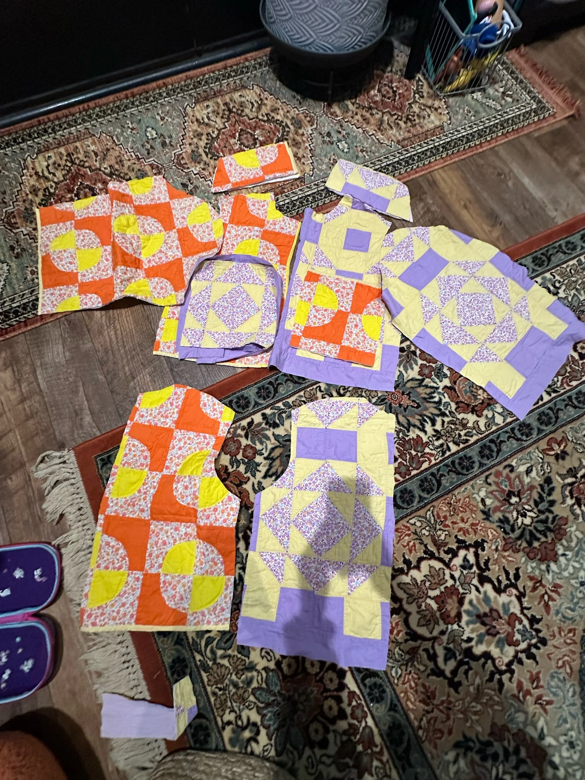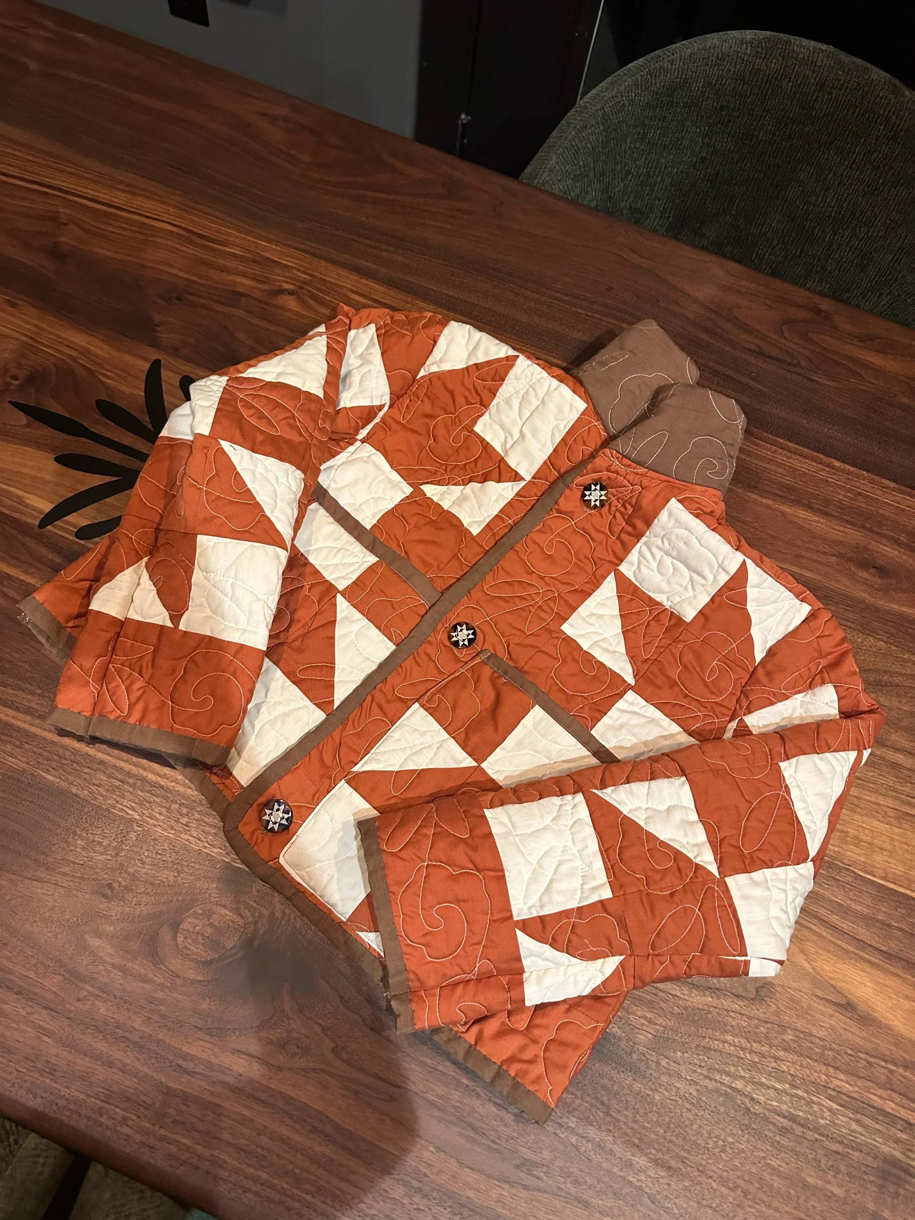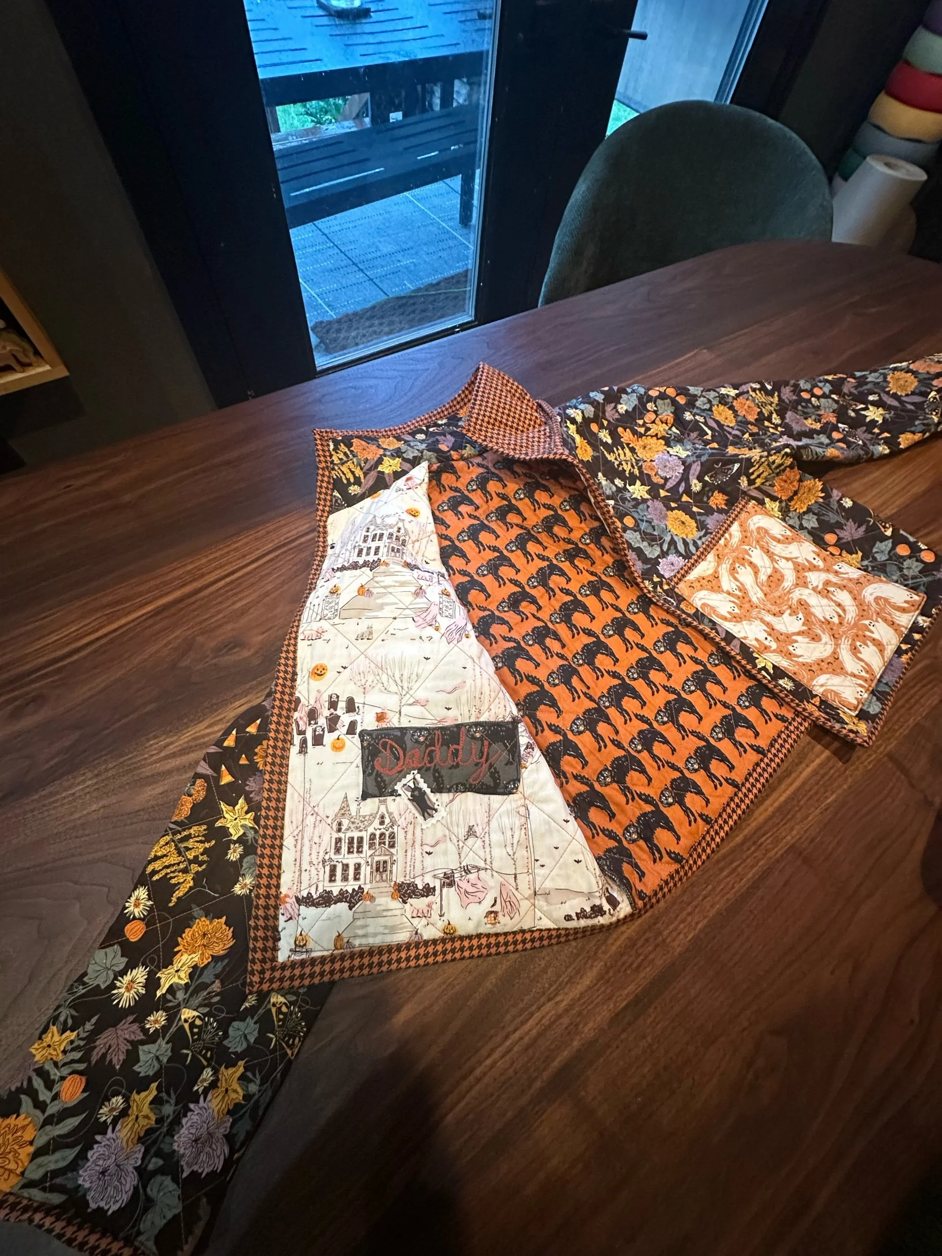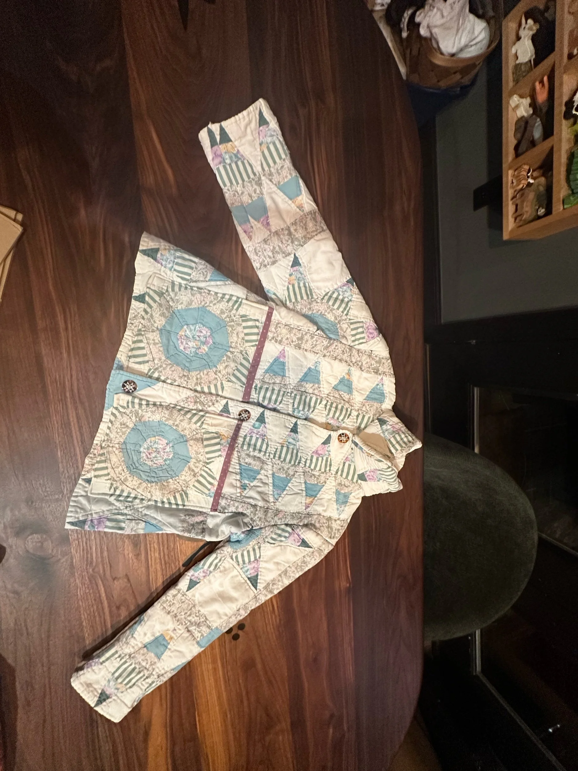 Custom quilt coat for a human. Look at my “available” vintage quilts on Instagram BlkLavaLamp or let me know what vibe you’re looking for and I’ll keep an eye out. Custom basic quilting with your choice of fabrics with my help of course available. Custom advanced piecing and quilting with your choice of fabrics with my help of course available.